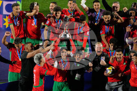 Payers of Morocco celebrate defeating Argentina in the FIFA U-20 World Cup final soccer match in Santiago, Chile, Sunday, Oct. 19, 2025. (AP Photo/Esteban Felix)