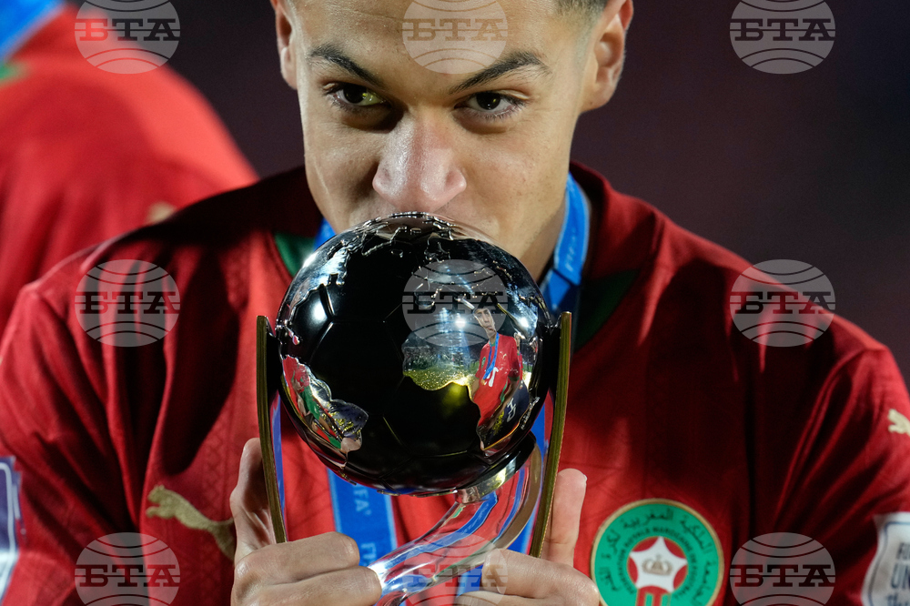 Morocco Yassine Khalifi kisses the trophy after defeating Argentina in the FIFA U-20 World Cup final soccer match in Santiago, Chile, Sunday, Oct. 19, 2025.(AP Photo/Matias Delacroix)