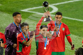 Morocco's Houssam Essadak raises the trophy after defeating Argentina to win the FIFA U-20 World Cup final soccer match in Santiago, Chile, Sunday, Oct. 19, 2025. (AP Photo/Gustavo Garello)
