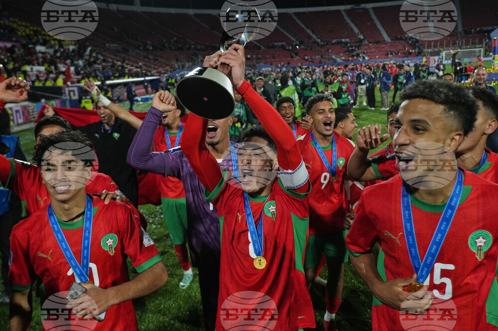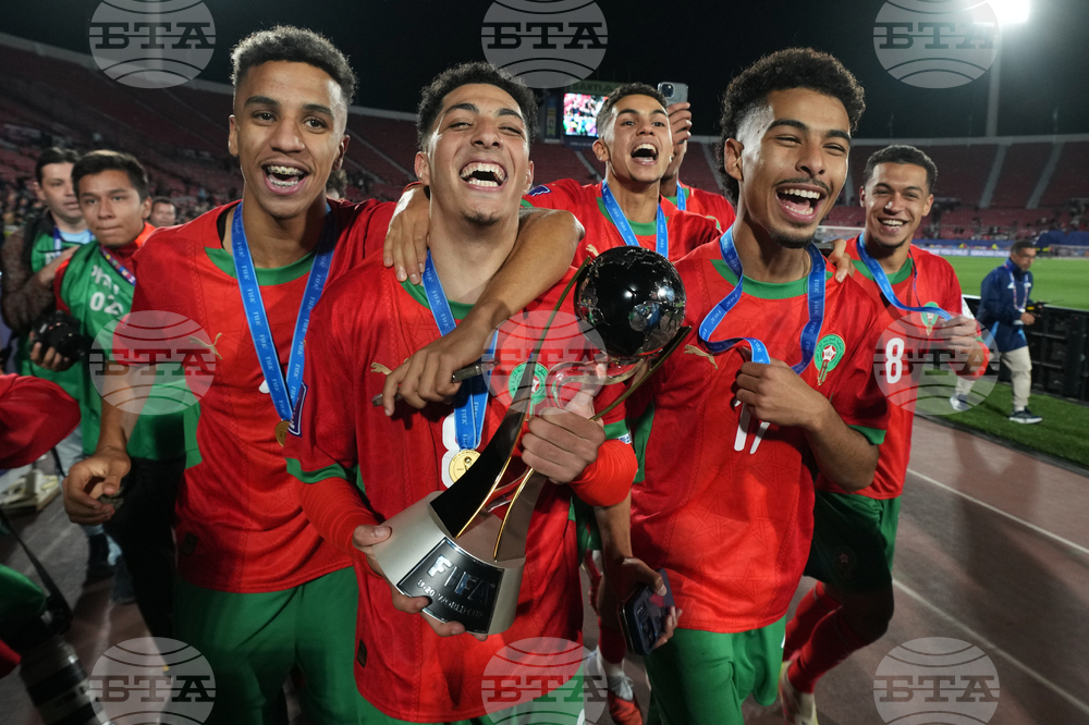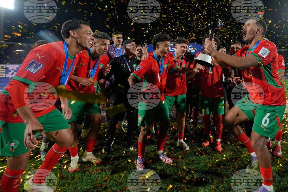 Players of Morocco celebrates with the trophy after defeating Argentina to win the FIFA U-20 World Cup final soccer match in Santiago, Chile, Sunday, Oct. 19, 2025. (AP Photo/Matias Delacroix)