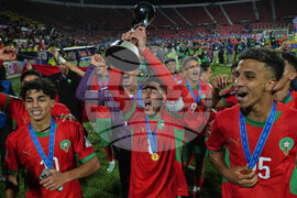 Morocco players celebrate with the trophy after defeating Argentina in the FIFA U-20 World Cup final soccer match in Santiago, Chile, Sunday, Oct. 19, 2025. (AP Photo/Andre Penner)