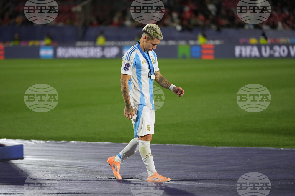 Argentina's Maher Carrizo walks off the field after losing the FIFA U-20 World Cup final soccer match against Morocco in Santiago, Chile, Sunday, Oct. 19, 2025. (AP Photo/Gustavo Garello)