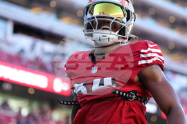 San Francisco 49ers running back Christian McCaffrey walks onto the field before an NFL football game against the Atlanta Falcons in Santa Clara, Calif., Sunday, Oct. 19, 2025. (Carlos Avila Gonzalez/San Francisco Chronicle via AP)