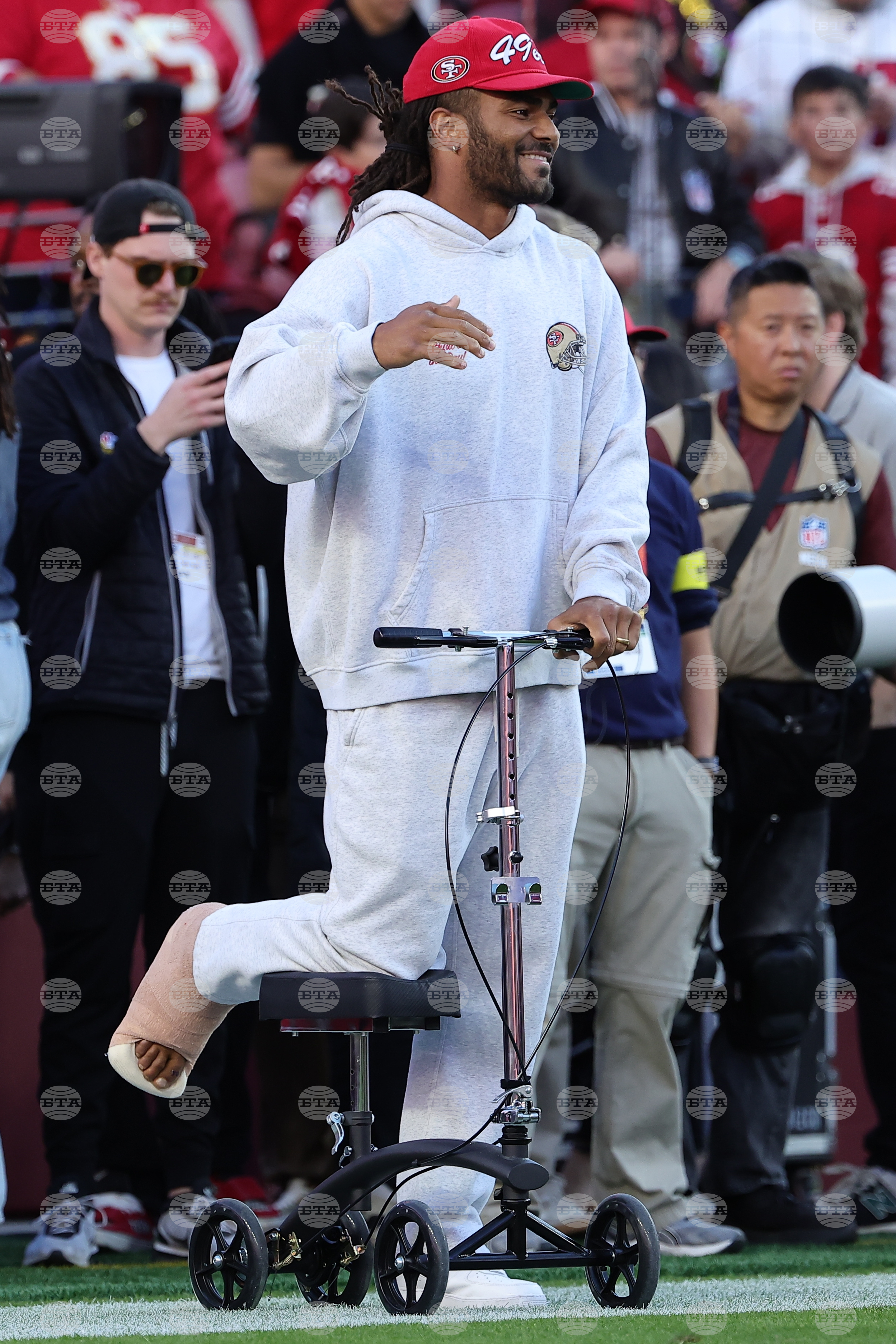 San Francisco 49ers middle linebacker Fred Warner watches team's warm up before an NFL football game against the Atlanta Falcons, Sunday, Oct. 19, 2025, in Santa Clara, Calif. (AP Photo/Kelley L Cox)