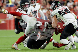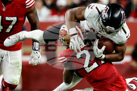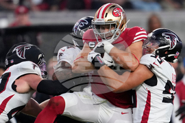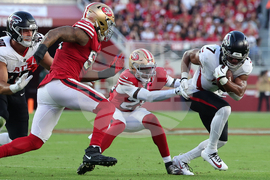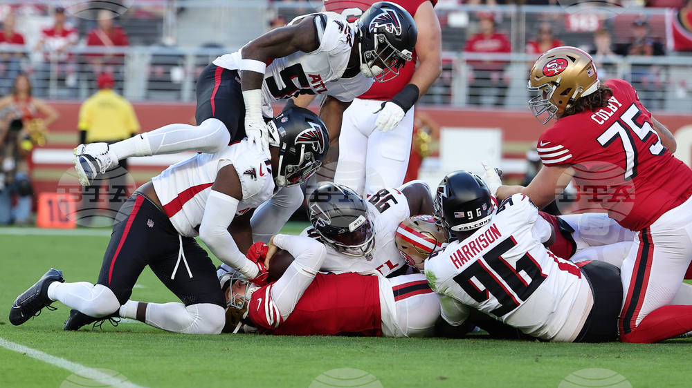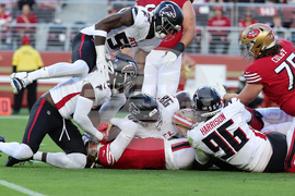 Atlanta Falcons' Bijan Robinson (7) is stopped by the San Francisco 49ers defense in the first half of an NFL football game in Santa Clara, Calif., on Sunday, Oct. 19, 2025. (Carlos Avila Gonzalez/San Francisco Chronicle via AP)