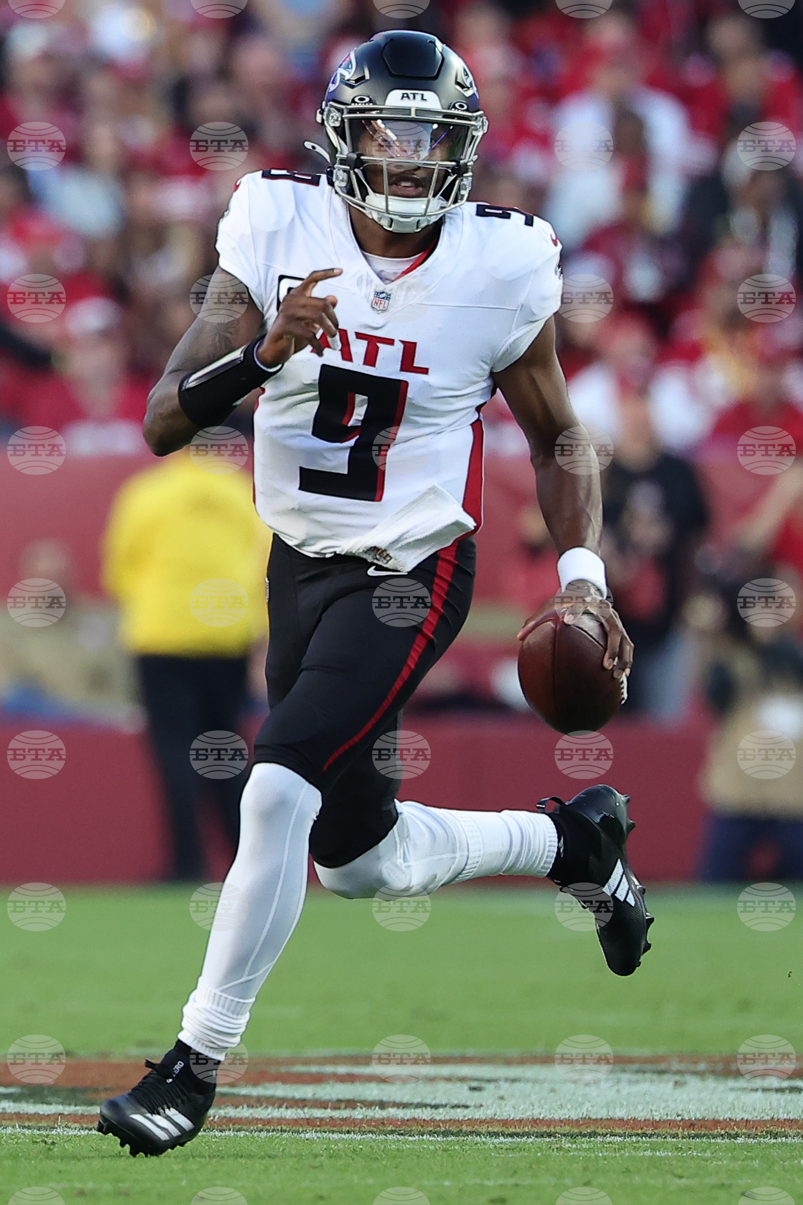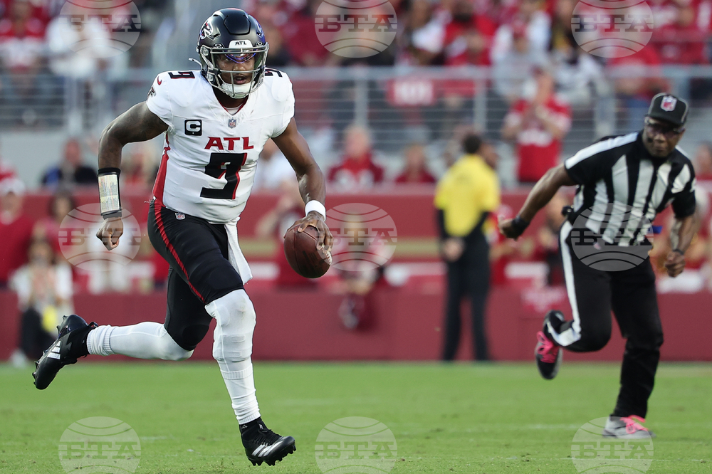 Atlanta Falcons quarterback Michael Penix Jr. (9) runs against the San Francisco 49ers in the first half of an NFL football game, Sunday, Oct. 19, 2025, in Santa Clara, Calif. (AP Photo/Kelley L Cox)