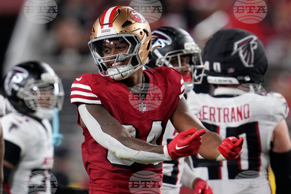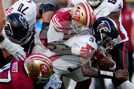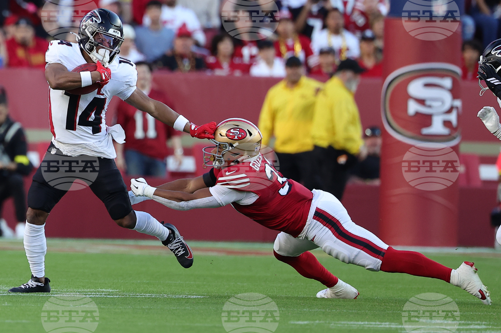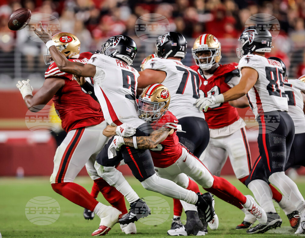 San Francisco 49ers' Chase Lucas sacks Atlanta Falcons' Michael Penix jr. (9) in the second half of an NFL football game in Santa Clara, Calif., on Sunday, Oct. 19, 2025. (Carlos Avila Gonzalez/San Francisco Chronicle via AP)
