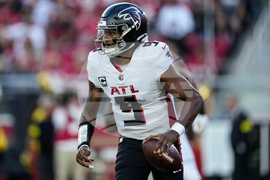 Atlanta Falcons quarterback Michael Penix Jr. speaks to reporters after an NFL football game against the San Francisco 49ers, Sunday, Oct. 19, 2025, in Santa Clara, Calif. (AP Photo/Kelley L Cox)