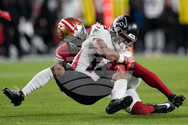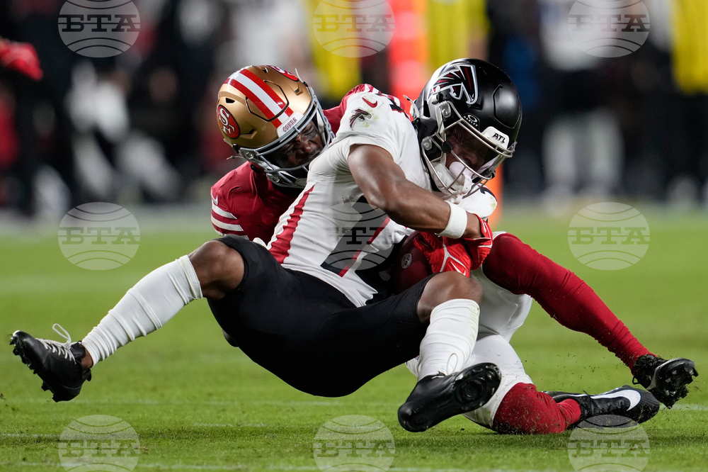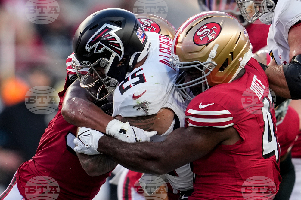 Atlanta Falcons running back Tyler Allgeier (25) is hit by San Francisco 49ers defensive end Bryce Huff (47) in the first half of an NFL football game, Sunday, Oct. 19, 2025, in Santa Clara, Calif. (AP Photo/Godofredo A. Vásquez)