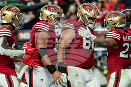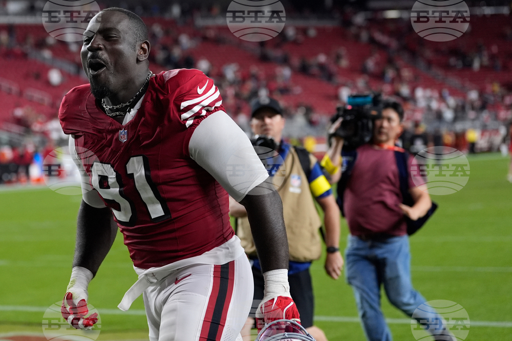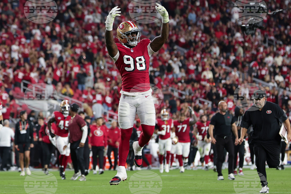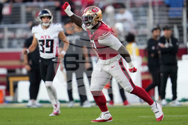 San Francisco 49ers defensive tackle Sam Okuayinonu (91) celebrates after an NFL football game between the San Francisco 49ers and the Atlanta Falcons, Sunday, Oct. 19, 2025, in Santa Clara, Calif. (AP Photo/Godofredo A. Vásquez)