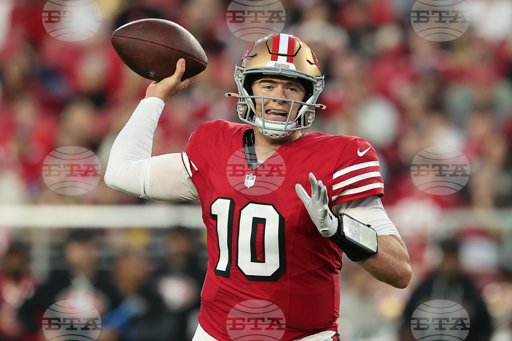 San Francisco 49ers' Mac Jones throws in the first half of an NFL football game against the Atlanta Falcons in Santa Clara, Calif., on Sunday, Oct. 19, 2025. (Carlos Avila Gonzalez/San Francisco Chronicle via AP)
