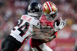 San Francisco 49ers running back Christian McCaffrey (23) is tackled by Atlanta Falcons cornerback Cobee Bryant (37) in the second half of an NFL football game, Sunday, Oct. 19, 2025, in Santa Clara, Calif. (AP Photo/Godofredo A. Vásquez)
