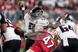 Atlanta Falcons defensive end Zach Harrison (96) pursues San Francisco 49ers quarterback Mac Jones (10) in the second half of an NFL football game, Sunday, Oct. 19, 2025, in Santa Clara, Calif. (AP Photo/Kelley L Cox)