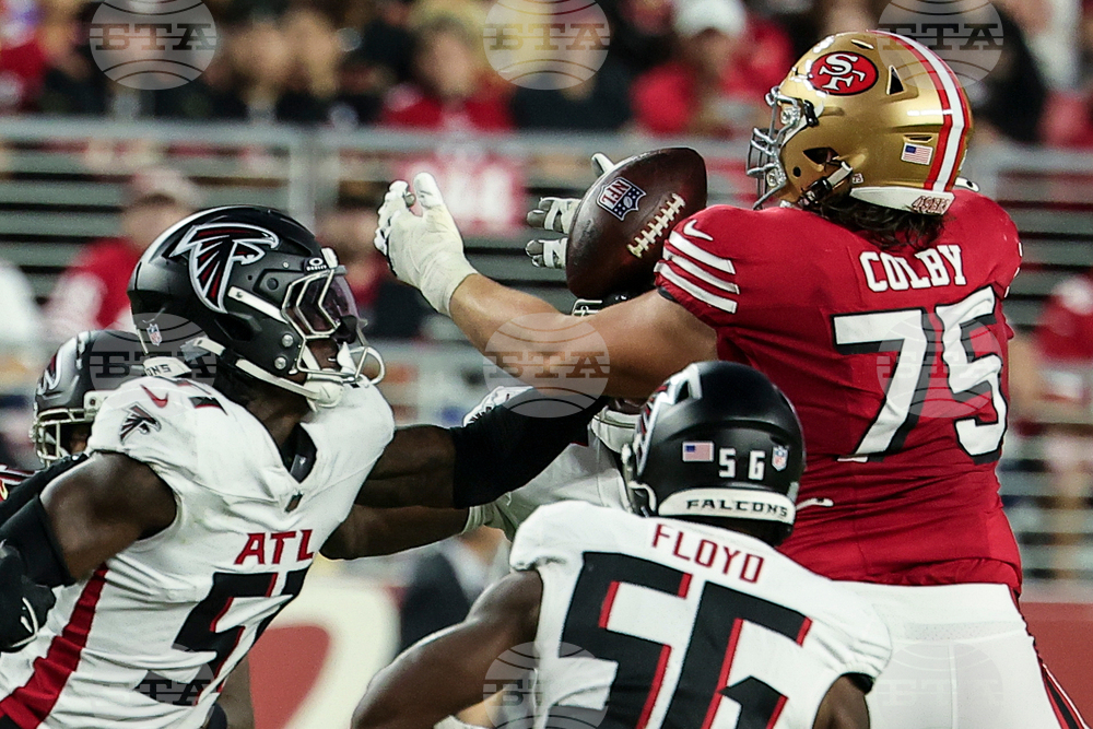 San Francisco 49ers guard Connor Colby (75) recovers a fumble against the Atlanta Falcons in the first half of an NFL football game, Sunday, Oct. 19, 2025, in Santa Clara, Calif. (AP Photo/Kelley L Cox)