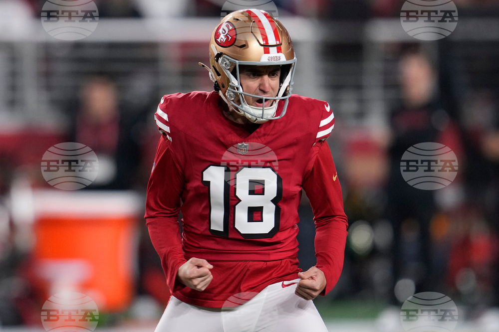 San Francisco 49ers tight end Brayden Willis (9) warms up before an NFL football game between the San Francisco 49ers and the Atlanta Falcons, Sunday, Oct. 19, 2025, in Santa Clara, Calif. (AP Photo/Godofredo A. Vásquez)
