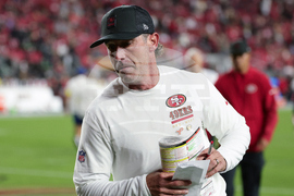 San Francisco 49ers head coach Kyle Shanahan walks off the field in the first half of an NFL football game against the Atlanta Falcons, Sunday, Oct. 19, 2025, in Santa Clara, Calif. (AP Photo/Kelley L Cox)