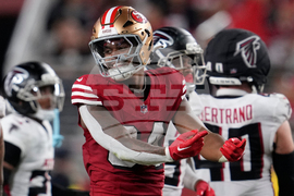 San Francisco 49ers wide receiver Russell Gage (84) celebrates a first down against the Atlanta Falcons in the second half of an NFL football game, Sunday, Oct. 19, 2025, in Santa Clara, Calif. (AP Photo/Godofredo A. Vásquez)