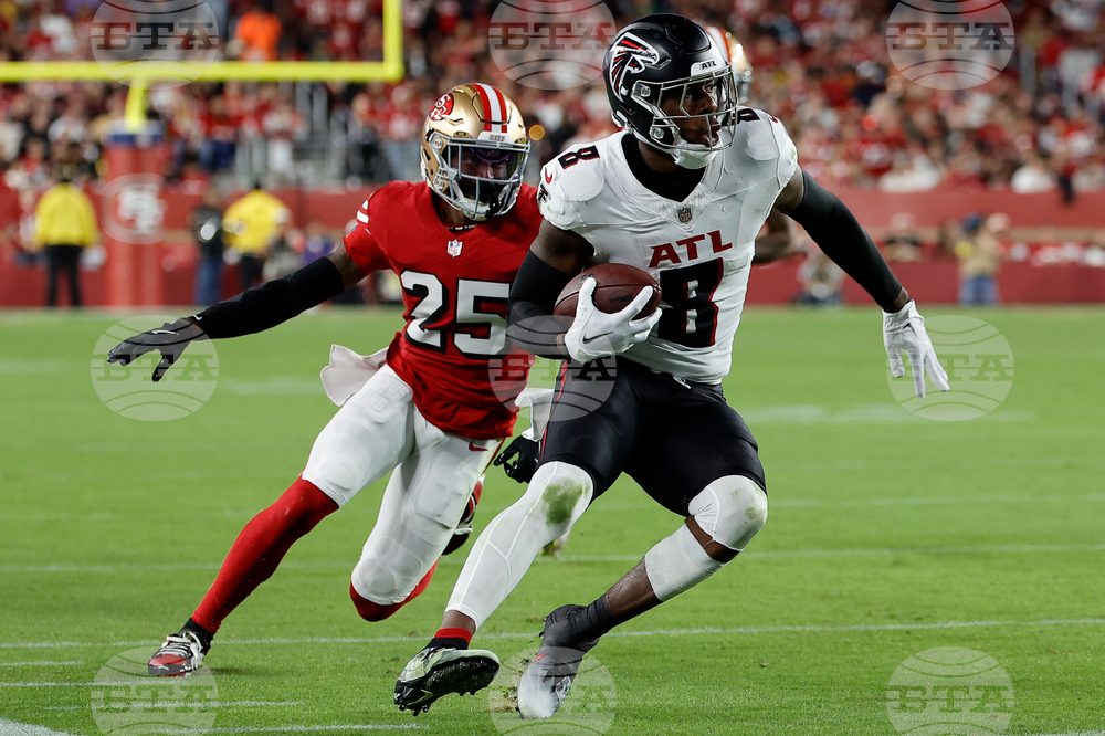 Atlanta Falcons wide receiver Drake London (5) runs against San Francisco 49ers safety Jason Pinnock (25) in the second half of an NFL football game, Sunday, Oct. 19, 2025, in Santa Clara, Calif. (AP Photo/Kelley L Cox)