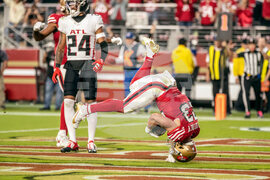 Christian McCaffrey somersaults in the end zone after his touchdown as the San Francisco 49ers played the Atlanta Falcons in the first half of an NFL football game in Santa Clara, Calif., on Sunday, Oct. 19, 2025. (Carlos Avila Gonzalez/San Francisco Chronicle via AP)