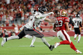 San Francisco 49ers' Mac Jones, right, is pressured by Atlanta Falcons' Leonard Floyd in second quarter of an NFL football game in Santa Clara, Calif., on Sunday, Oct. 19, 2025. (Scott Strazzantez/San Francisco Chronicle via AP)