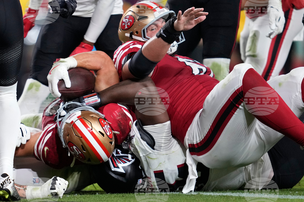 San Francisco 49ers' Alfred Collins, center, recovers a fumble by Atlanta Falcons' Michael Penix, Jr. in the second quarter of an NFL football game in Santa Clara, Calif., on Sunday, Oct. 19, 2025. (Scott Strazzantez/San Francisco Chronicle via AP)