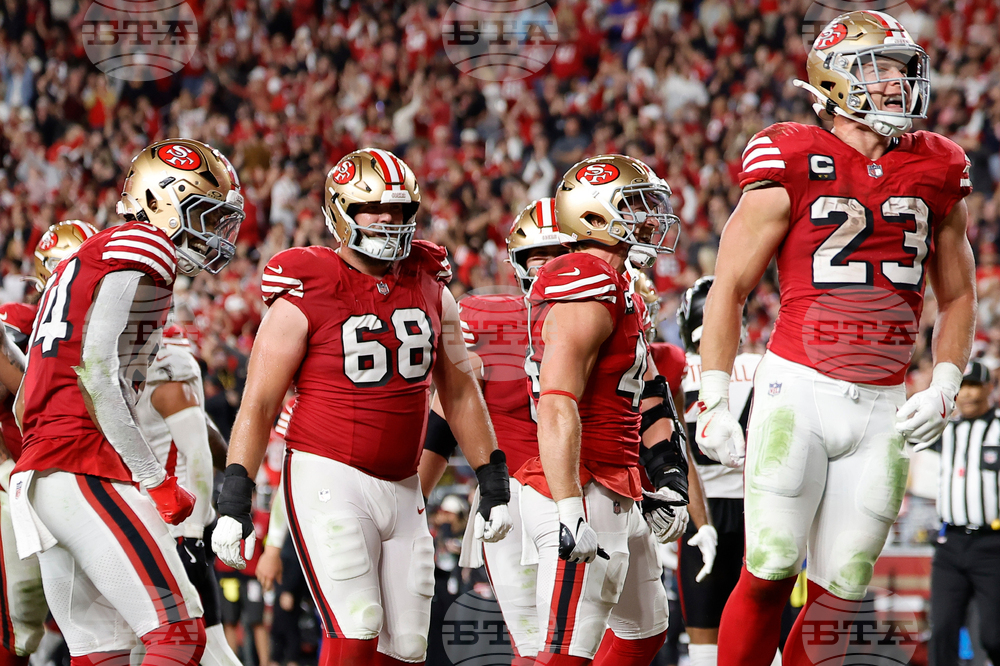 San Francisco 49ers running back Christian McCaffrey (23) celebrates his touchdown against the Atlanta Falcons in the first half of an NFL football game, Sunday, Oct. 19, 2025, in Santa Clara, Calif. (AP Photo/Kelley L Cox)