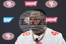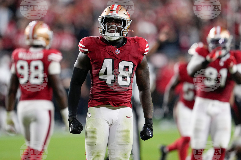 San Francisco 49ers linebacker Tatum Bethune speaks to reporters after an NFL football game against the Atlanta Falcons, Sunday, Oct. 19, 2025, in Santa Clara, Calif. (AP Photo/Godofredo A. Vásquez)
