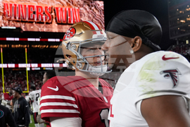 San Francisco 49ers quarterback Mac Jones (10) speaks with Atlanta Falcons quarterback Michael Penix Jr. (9) after an NFL football game, Sunday, Oct. 19, 2025, in Santa Clara, Calif. (AP Photo/Godofredo A. Vásquez)