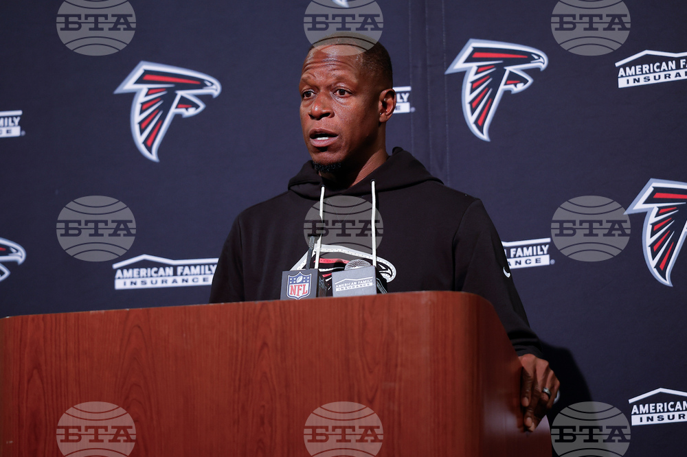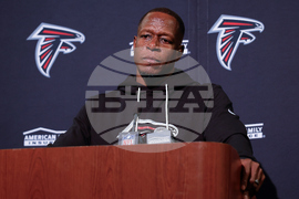 Atlanta Falcons head coach Raheem Morris speaks after an NFL football game against the San Francisco 49ers, Sunday, Oct. 19, 2025, in Santa Clara, Calif. (AP Photo/Kelley L Cox)