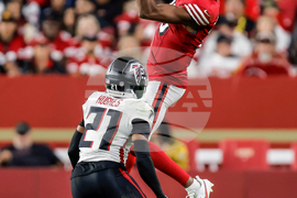 San Francisco 49ers Jauan Jennings (15) leaps for a catch in the second half of an NFL football game against the Atlanta Falcons in Santa Clara, Calif., on Sunday, Oct. 19, 2025. (Carlos Avila Gonzalez/San Francisco Chronicle via AP)