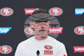 San Francisco 49ers head coach Kyle Shanahan speaks to reporters after an NFL football game against the Atlanta Falcons, Sunday, Oct. 19, 2025, in Santa Clara, Calif. (AP Photo/Godofredo A. Vásquez)