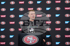 San Francisco 49ers quarterback Mac Jones speaks to reporters after an NFL football game against the Atlanta Falcons, Sunday, Oct. 19, 2025, in Santa Clara, Calif. (AP Photo/Godofredo A. Vásquez)