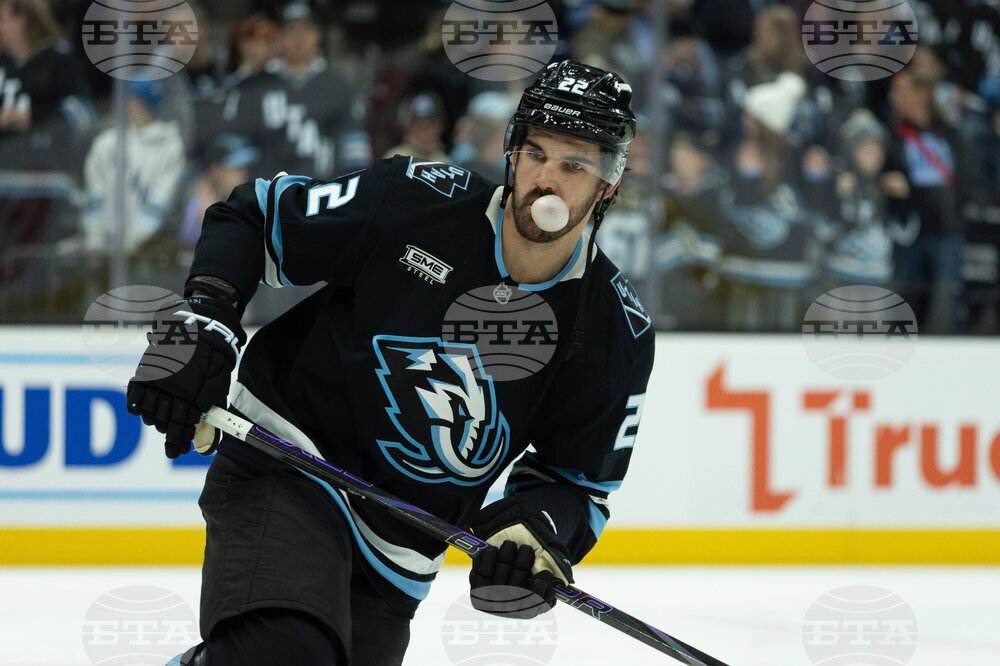 Utah Mammoth center Jack McBain skates on the ice during warmups before an NHL hockey game against the Boston Bruins, Sunday, Oct. 19, 2025, in Salt Lake City. (AP Photo/Melissa Majchrzak)