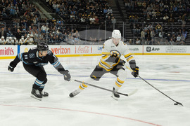 Utah Mammoth center Kevin Stenlund (82) moves the puck against Boston Bruins center John Beecher (19) during the first period of an NHL hockey game Sunday, Oct. 19, 2025, in Salt Lake City. (AP Photo/Melissa Majchrzak)