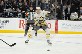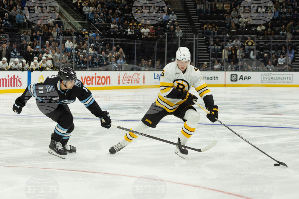 Boston Bruins center Morgan Geekie (39) goes after the puck against Utah Mammoth center Kevin Stenlund (82) during the third period of an NHL hockey game Sunday, Oct. 19, 2025, in Salt Lake City. (AP Photo/Melissa Majchrzak)
