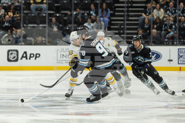 Utah Mammoth defense Mikhail Sergachev (98) goes after the puck against Boston Bruins center Morgan Geekie (39) during the third period of an NHL hockey game Sunday, Oct. 19, 2025, in Salt Lake City. (AP Photo/Melissa Majchrzak)