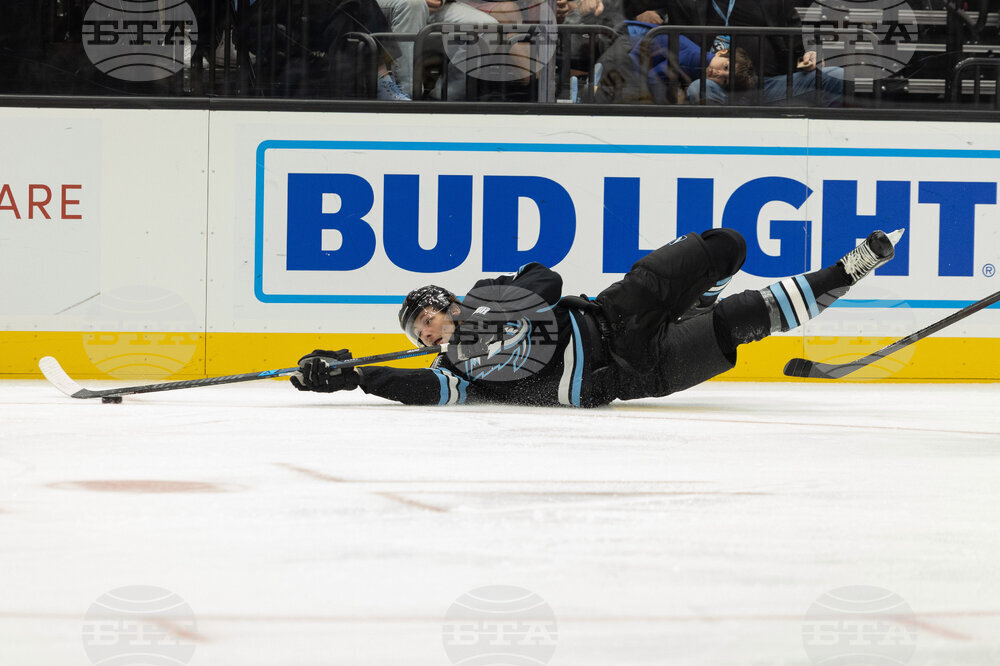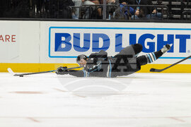 Utah Mammoth defense John Marino (6) goes down after the puck against Boston Bruins during the second period of an NHL hockey game Sunday, Oct. 19, 2025, in Salt Lake City. (AP Photo/Melissa Majchrzak)