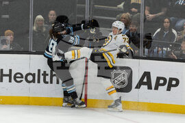 Utah Mammoth fights with the Boston Bruins during the second period of an NHL hockey game Sunday, Oct. 19, 2025, in Salt Lake City. (AP Photo/Melissa Majchrzak)