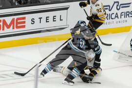 Utah Mammoth right wing Dylan Guenther (11) goes down after the puck against Boston Bruins defense Andrew Peeke (26) during the third period of an NHL hockey game Sunday, Oct. 19, 2025, in Salt Lake City. (AP Photo/Melissa Majchrzak)