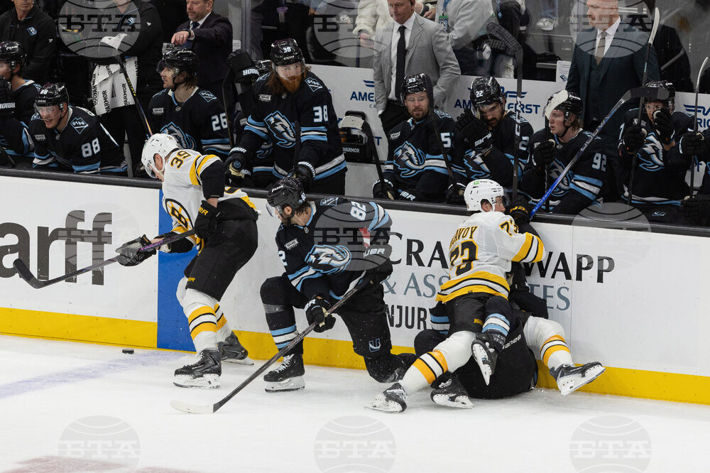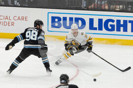 Utah Mammoth right wing Dylan Guenther (11) and Boston Bruins defense Nikita Zadorov (91) watch the puck during the second period of an NHL hockey game Sunday, Oct. 19, 2025, in Salt Lake City. (AP Photo/Melissa Majchrzak)