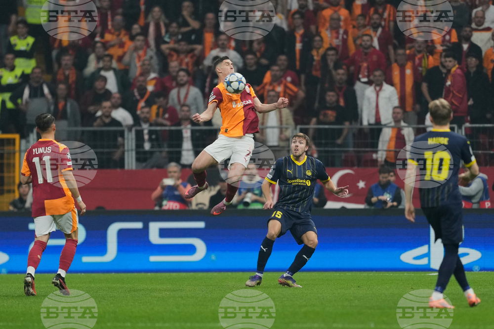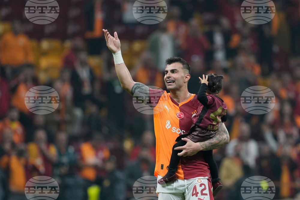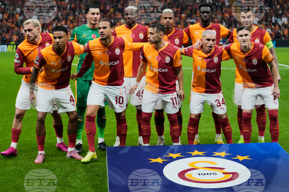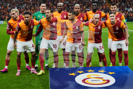 Galatasaray players pose ahead of the Champions League opening phase soccer match between Galatasaray and Bodo Glimt, in Istanbul, Turkey, Wednesday, Oct. 22, 2025. (AP Photo/Khalil Hamra)