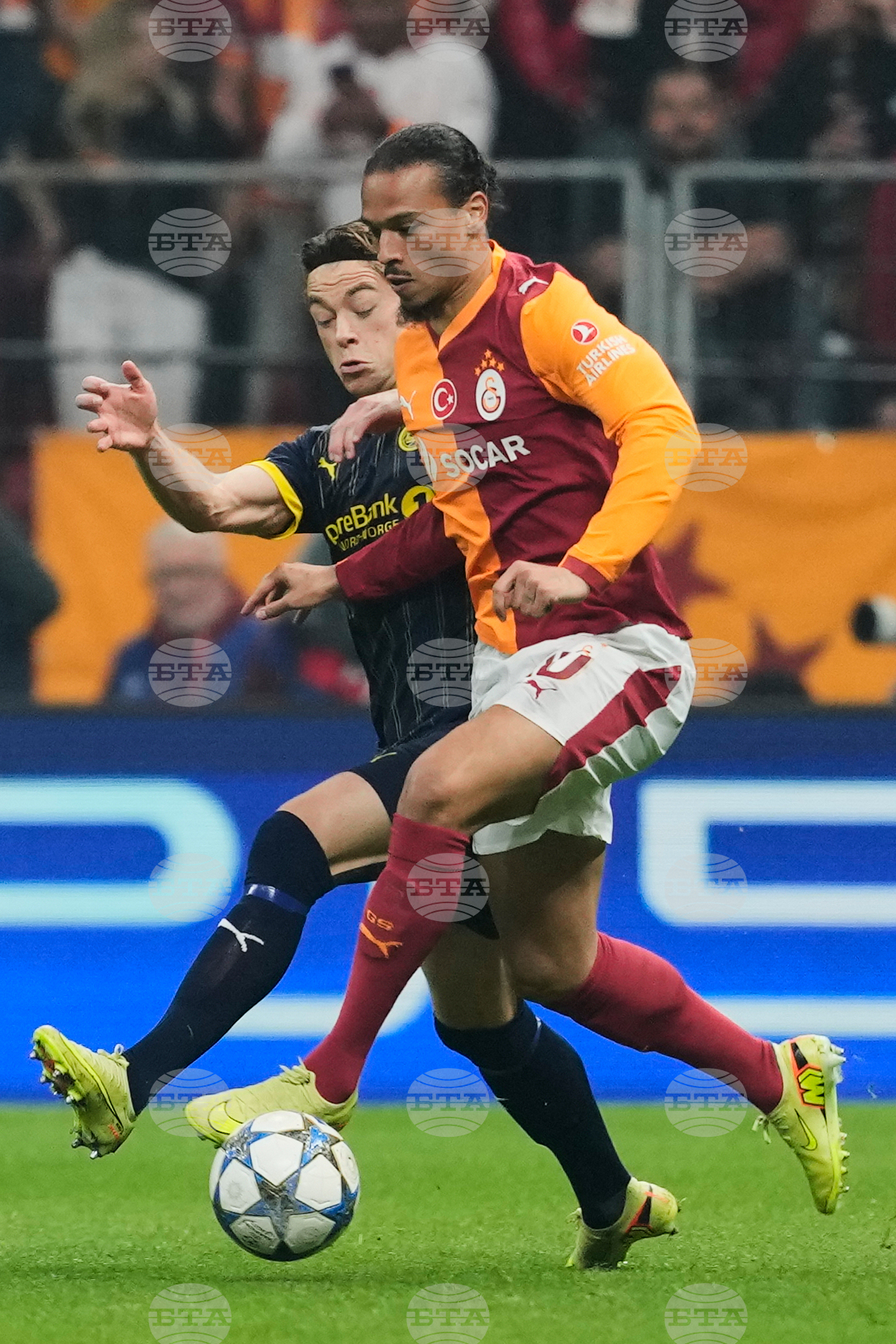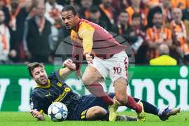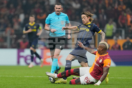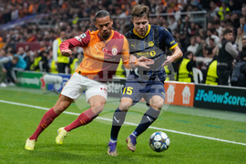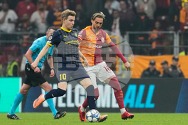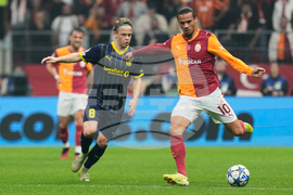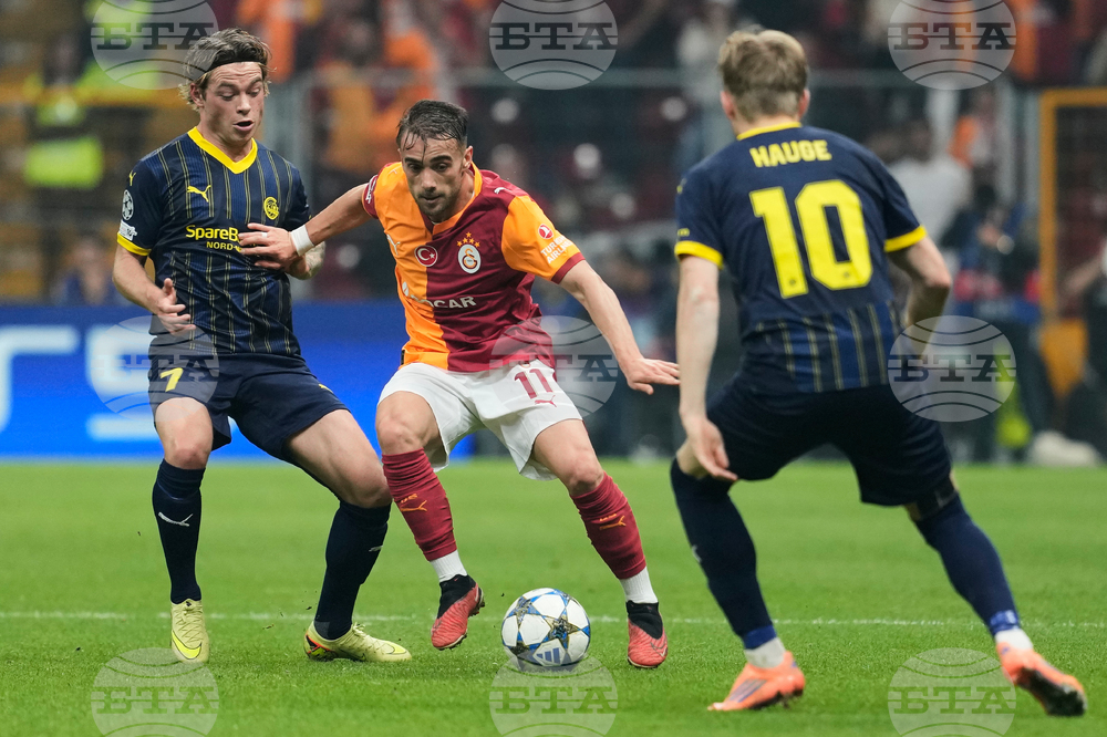 Galatasaray's Yunus Akgun, right, controls the ball during the Champions League opening phase soccer match between Galatasaray and Bodo Glimt, in Istanbul, Turkey, Wednesday, Oct. 22, 2025. (AP Photo/Khalil Hamra)