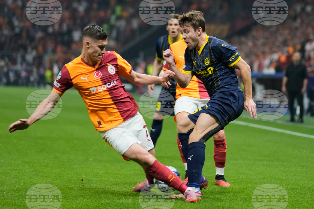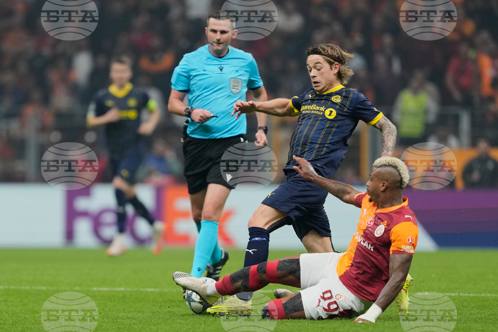 Galatasaray's Roland Sallai, center left, duels for the ball with Glimt's Fredrik Andre Bjorkan during the Champions League opening phase soccer match between Galatasaray and Bodo Glimt, in Istanbul, Turkey, Wednesday, Oct. 22, 2025. (AP Photo/Khalil Hamra)