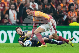 Glimt's Jens Petter Hauge, top, duels for the ball with Galatasaray's Davinson Sanchez during the Champions League opening phase soccer match between Galatasaray and Bodo Glimt, in Istanbul, Turkey, Wednesday, Oct. 22, 2025. (AP Photo/Khalil Hamra)