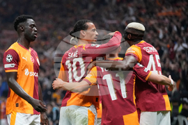 Galatasaray's Yunus Akgun, front, celebrates with teammates after scoring his side's third goal during the Champions League opening phase soccer match between Galatasaray and Bodo Glimt, in Istanbul, Turkey, Wednesday, Oct. 22, 2025. (AP Photo/Khalil Hamra)