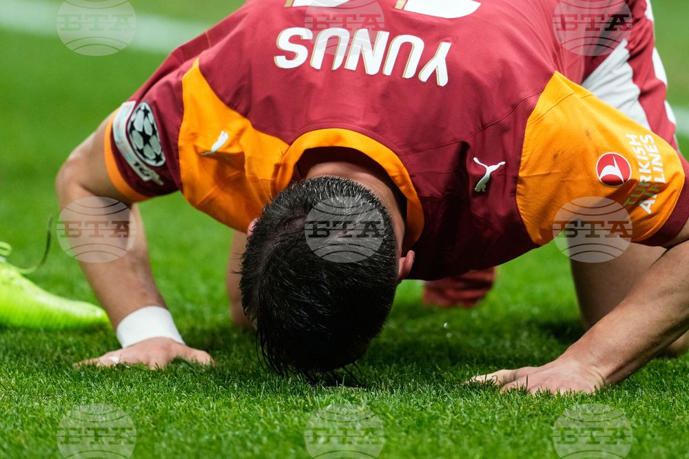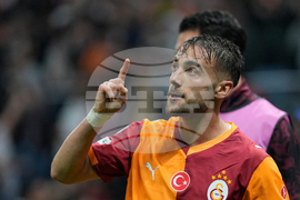 Galatasaray's Yunus Akgun celebrates after scoring his side's third goal during the Champions League opening phase soccer match between Galatasaray and Bodo Glimt, in Istanbul, Turkey, Wednesday, Oct. 22, 2025. (AP Photo/Khalil Hamra)