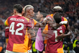 Galatasaray's Victor Osimhen celebrates with teammates after scoring the opening goal during the Champions League opening phase soccer match between Galatasaray and Bodo Glimt, in Istanbul, Turkey, Wednesday, Oct. 22, 2025. (AP Photo/Khalil Hamra)