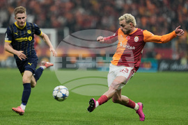 Galatasaray's Baris Yilmaz, right, kicks the ball during the Champions League opening phase soccer match between Galatasaray and Bodo Glimt, in Istanbul, Turkey, Wednesday, Oct. 22, 2025. (AP Photo/Khalil Hamra)