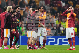 Galatasaray players celebrate at the end of the Champions League opening phase soccer match between Galatasaray and Bodo Glimt, in Istanbul, Turkey, Wednesday, Oct. 22, 2025. (AP Photo/Khalil Hamra)