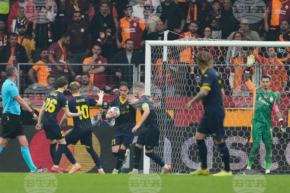 Bodo Glimt players celebrate scoring their side first goal during the Champions League opening phase soccer match between Galatasaray and Bodo Glimt, in Istanbul, Turkey, Wednesday, Oct. 22, 2025. (AP Photo/Khalil Hamra)